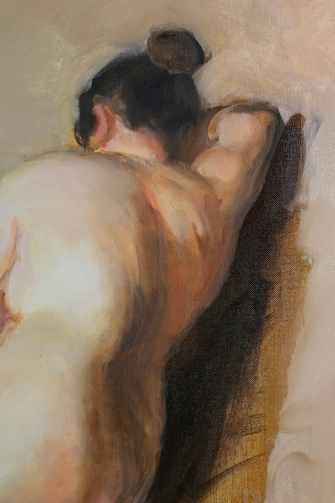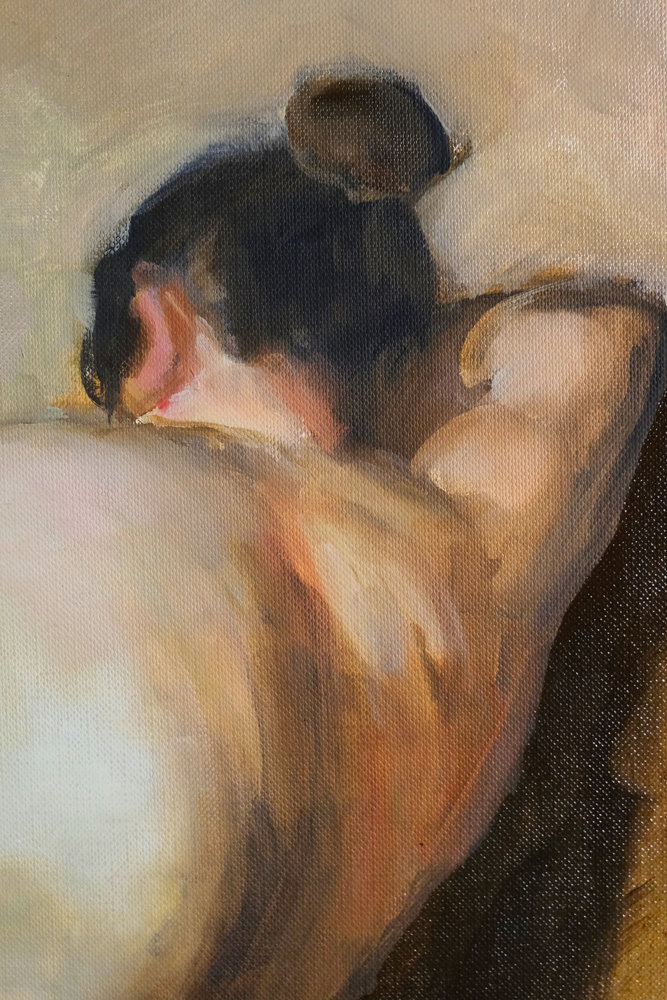 J’ai découvert par hasard le travail d’Amalia Lindegren, et j’ai traité cette copie avec fidélité. J’ai particulièrement travaillé l’attitude et le mouvement du corps, et les harmonies d’ocre et de terre de sienne naturelle et brûlée.